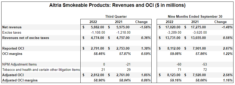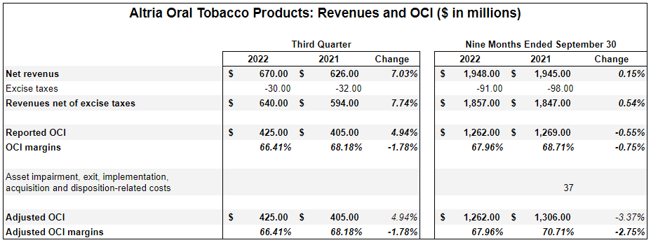 Turning to the oral tobacco products segment, we can see impressive results. Net revenues were up 7%. More importantly, revenues net of excise taxes were up 7.74%, and reported OCI was up nearly 5%, with OCI margin dropping 178 bps. The margin dynamics of this segment may appear less rosy than the smokeable segment, but there are several things occurring under the hood.
