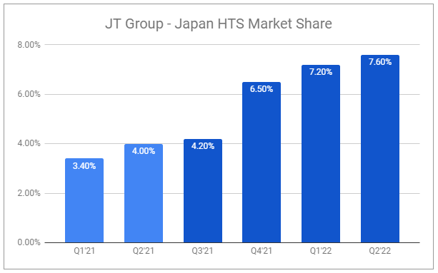 JT Group launched its HTS device, Ploom X, in Japan in August 2021 and has already nearly doubled its share of the Japanese HTS market. Japan is notoriously saturated with heated tobacco products and JT Group faces significant competition, including from PMI’s IQOS. Share growth demonstrates a product that is simply winning over consumers, and the data produced will allow the company to iterate and improve leading up to U.S. commercialization.