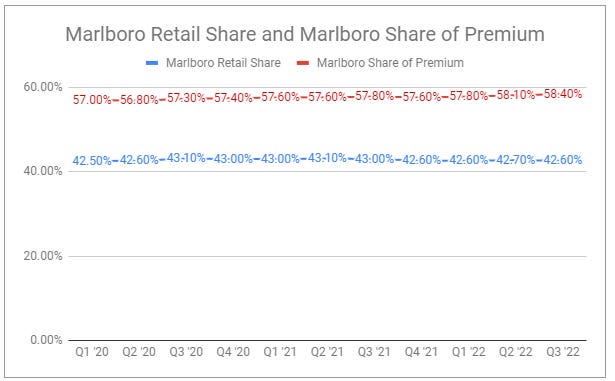 These numbers are the result of the mechanics that too few appreciate. Fewer cigarettes are sold each year, equating to lower costs and excise taxes paid. With pricing power, revenues net of excise increase, as does OCI, and margins expand. In Q3 2022, Altria’s manufacturer net price realization was +10.2% but Marlboro’s retail price per pack increased only 6%, which was less than overall inflation.