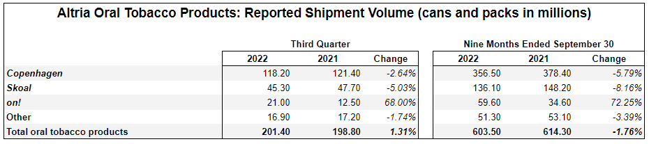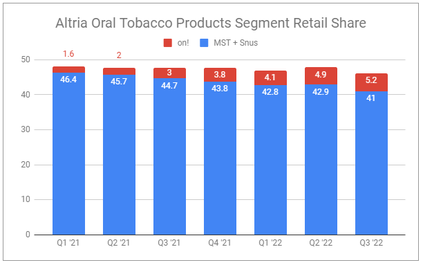 Volumes of legacy products like Copenhagen and Skoal continue to decline. Similarly to cigarettes, pricing power allows Altria to more than offset this. However, the company continues to aggressively promote its newest nicotine pouch, on!, by using extreme pricing deals to drive consumer awareness and adoption.