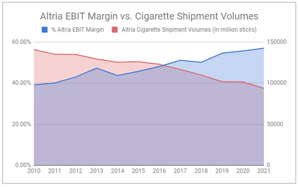I believe this period’s volume decline is likely an outlier, opposite to the positive outlier that 2020 ended up being. While it would be unwise to assume that volume declines would revert to the 4.5% range, it is not unreasonable to think that they would continue to come down alongside macro pressures, especially fuel prices. Any reversion and normalization of smokeable product volume declines will provide Altria with more flexibility moving forward. Additionally, this reminds us that while volumes are resilient in periods of economic weakness, they are certainly not immune. Nonetheless, PM USA’s ability to navigate such a steep volume decline and still increase revenues net of excise taxes and OCI is truly remarkable.