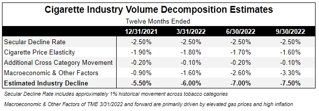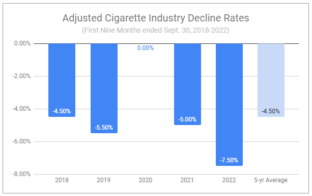 Looking at the following two sets of numbers helps illustrate how severe the cigarette volume decline was:
