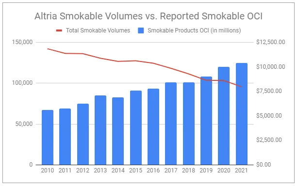 These numbers aren’t what you’d call pretty. The 3.5% decrease in the top line was partly driven by the fact that Altria sold its Ste. Michelle wine business in October 2021. The company also experienced a decline in net revenues in the smokeable products segment. But digging deeper, a different picture emerges.