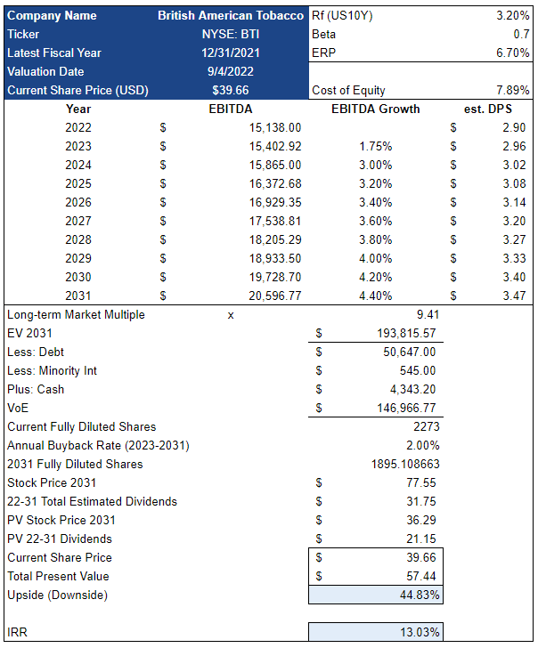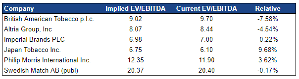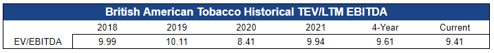 This gives British American Tobacco an implied EV/EBITDA of 9.02, ~7.5% lower than its current multiple.