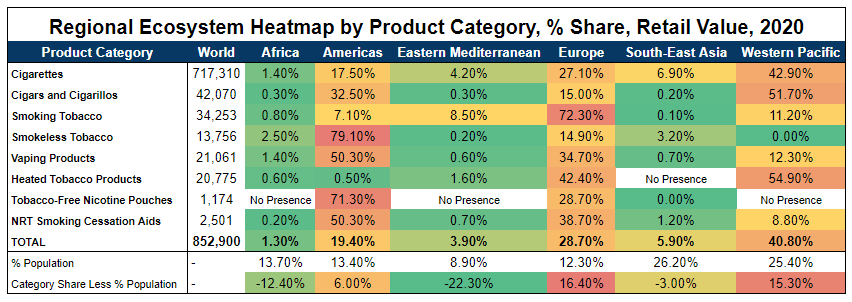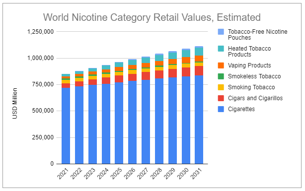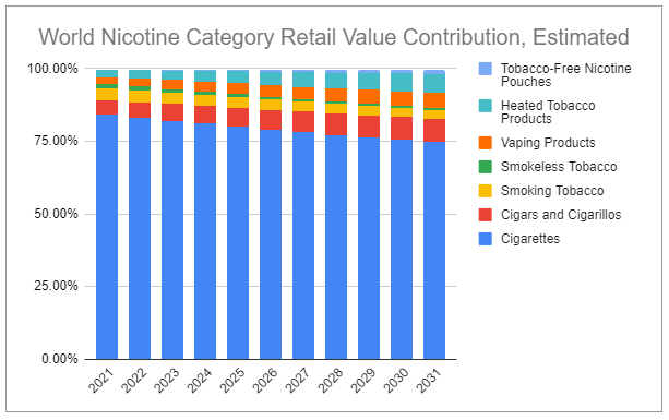 New categories, like Vaping, Heated Tobacco (HTP), and Modern Oral (Tobacco-Free Nicotine Pouches), are fast-growing, though are currently still small pieces of overall volumes and retail value.