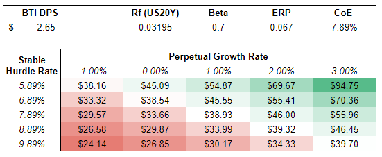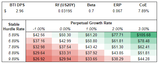 British American Tobacco has a long history of paying and increasing its dividend. I would argue that BAT, thanks to New Categories, is entering a period of moderate growth and that the GGM may be inappropriate to use, as it would undoubtedly over-discount. Nonetheless, it’s one more tool to use to take a quick snapshot.