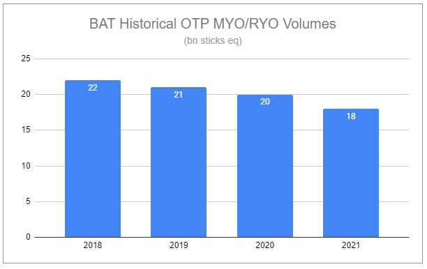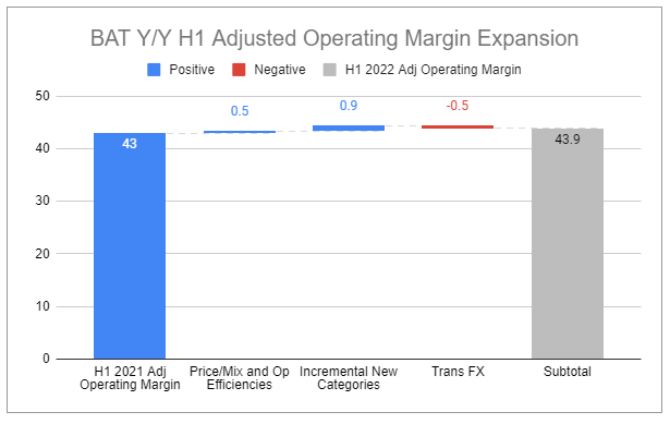 British American Tobacco’s OTP category primarily consists of make-your-own and roll-your-own products. In H1 2022, OTP volumes were ~8.2 billion, down ~11% y/y. Pricing power can offset losses in revenue and bolster profitability but ultimately will amplify future declines. I expect this trend to continue, especially as New Categories gain popularity.