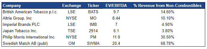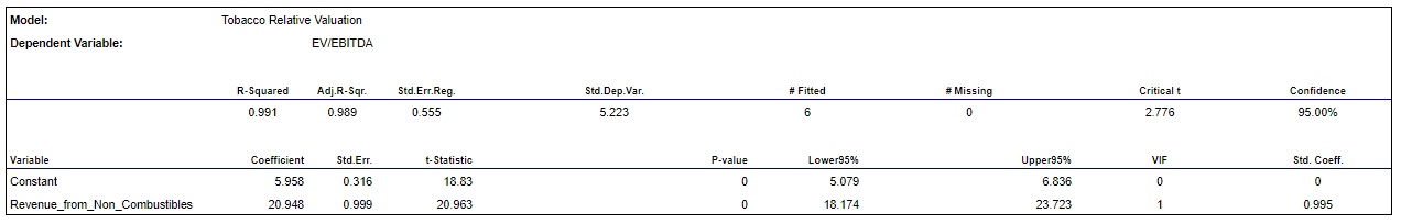 Due to the consolidated nature of the tobacco and nicotine industry, a comparison is limited. This is especially true since many names are either considerably smaller than BAT or are more linked to tobacco as a commodity rather than to marketable consumer goods. Five companies remain to compare directly to British American Tobacco. I ran a simple regression to normalize the EV/EBITDA for each company by weighing the percentage of revenue each derives from non-combustibles as of their most recent quarterly filings.