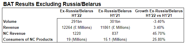 In H1 2022, BAT’s Combustibles accounted for 83.7% of revenue. Value share gained +10 bps while Combustibles volume share decreased -10 bps. Paired with +4.8% price/mix, this lead to 0.6% revenue growth for the period.