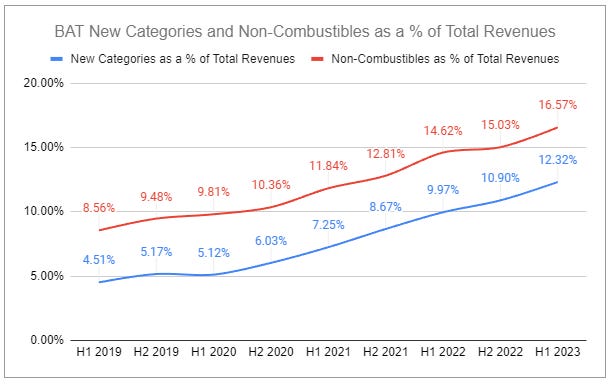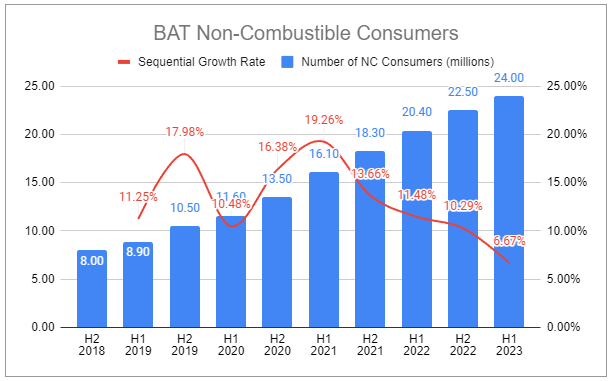 Despite continued declines in traditional oral volumes, BAT’s total number of non-combustible consumers continues to grow in lock-step fashion, thanks to New Categories.