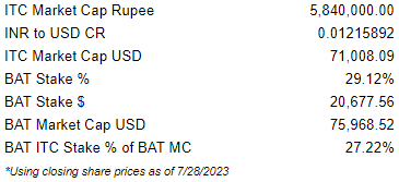 Due to ITC’s stock-based compensation, BAT’s stake decreased from 29.19% to 29.12%. Nonetheless, ITC shares have tracked higher, and the stake’s market value is now over 27% of BAT’s market cap. I previously wrote why focusing on the market value of BAT’s stake was perhaps non-ideal. However, just last week, ITC announced a proposal to spin out its hotel business (you can view the investor presentation covering the proposal here). The segment was responsible for a mere 4% of ITC’s total revenues and just over 2% of profit last year, but the business holds over 120 hotels and a spin would create a pure-play stake for BAT. Not only would this be a smaller stake, but it would be unbound by some of the additionally stringent regulations affecting investment into Indian tobacco companies, potentially allowing BAT a clear path to sell the new stake to unlock value for shareholders.