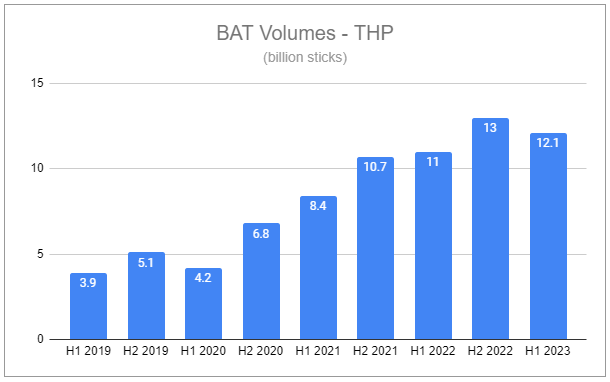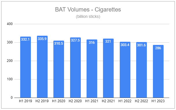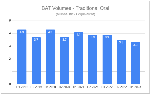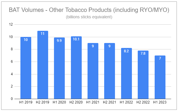 Such competitive pressures are undeniable. While glo’s volume share of combustibles + heated tobacco grew from 3.8% to 4% y/y in H1 2023, its share of heated tobacco volumes as a standalone category decreased from 19.6% to 18.2%. BAT’s heated tobacco unit volumes grew 10% y/y and associated revenues grew at 10.6% y/y in H1 2023, which is unmistakably positive but pales in comparison to the recent growth of PMI’s IQOS HTUs, which in Q2 2023 were up 26.6% y/y on top of positive price take, despite already holding the lion’s share of the heated tobacco market.