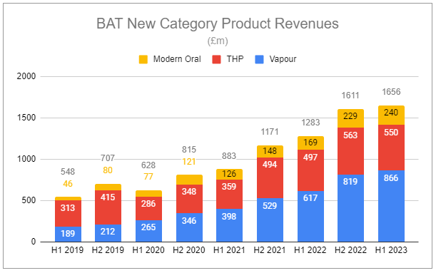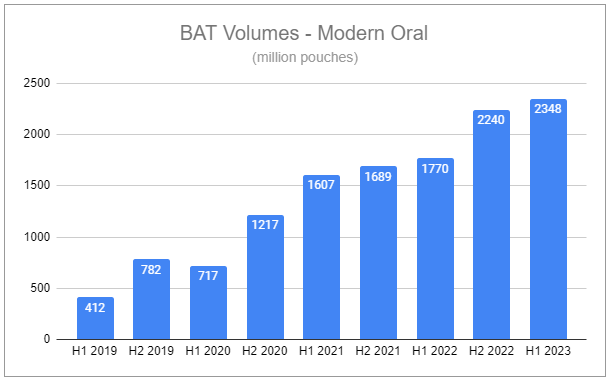 In H1 2023, British American Tobacco’s New Categories each experienced varying degrees of volume growth and pricing and in the aggregate continued an impressive trend, with revenues up 29.07% y/y (26.6% at constant currency).