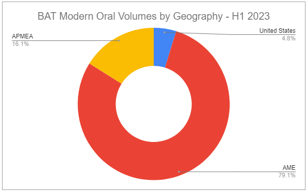 In H1 2023, BAT Modern Oral volumes increased 32.66% y/y, driven by exceptional growth in the AME and APMEA regions of 38.4% and 49.3%, respectively. Category revenues increased at an even greater rate—41.8% y/y for the period. The category’s share of total oral in key markets continued to expand, up to 8.1% in H1 2023, from 7.1% the year prior, and up from 1.5% in H1 2019. It is fair to say that Velo across many parts of the world is the stand-out leader. However, there is one major standout concern: Velo in the United States is currently a total dud.