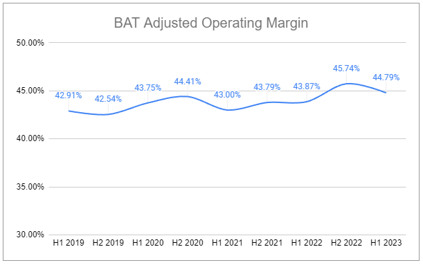 In H1 2023, BAT’s total cigarette volumes declined by 5.7% y/y, largely due to continued weakness in the United States, where volumes dropped by 12.4% y/y for the period. An estimated 8.4% decrease in industry volumes was amplified for BAT by a 2.7% share loss, a 0.7% decrease from inventory reductions related to the SAP roll-out, and a 0.6% decrease from the California flavor ban. The company, having a 45% volume exposure to the flavor ban, saw a >85% retention in combustibles following. Strong performance in its premium share looks favorable for the company to continue to drive value.