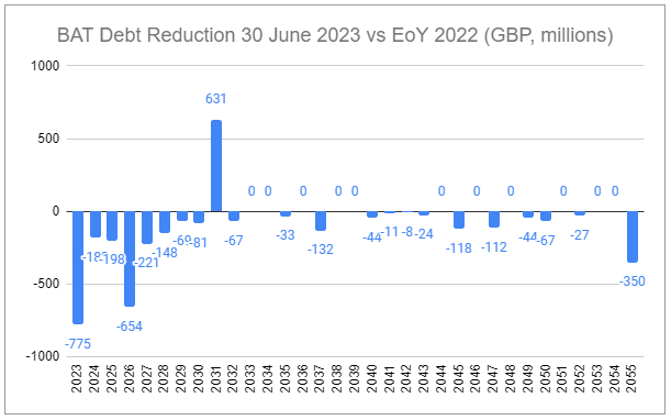 British American Tobacco has continued to make solid progress in deleveraging its balance sheet toward its goal of x2.5 adjusted net debt/ adjusted EBITDA. At EoY 2021, the multiple rested at x2.99, and at EoY 2022 sat at x2.89. Updated numbers show the multiple now sitting at x2.6. The company’s current average cost of debt is 4.3%, and as maturities come due, rolling debt forward will inevitably increase the company’s interest expense, which for FY 2023 is expected to be £1.9 billion. While this will act as a drag, the company is poised to reach its target ratio by the end of the year. I believe the odds the company reinstates share repurchases by H2 2024 are high.