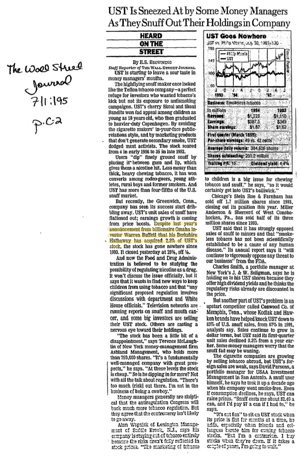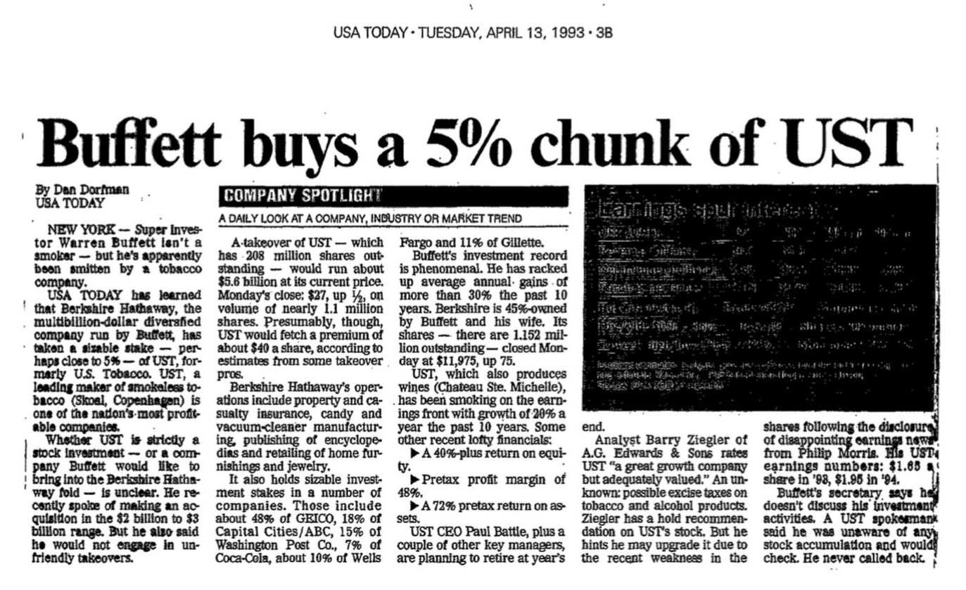 In April 1993, Berkshire took a sizable stake in UST, U.S. Smokeless Tobacco. The specifics of this deal are a bit murky. Initial claims posited Berkshire’s stake could have been near 5%, which, based on where shares were trading, would have made the stake worth ~$290 million.