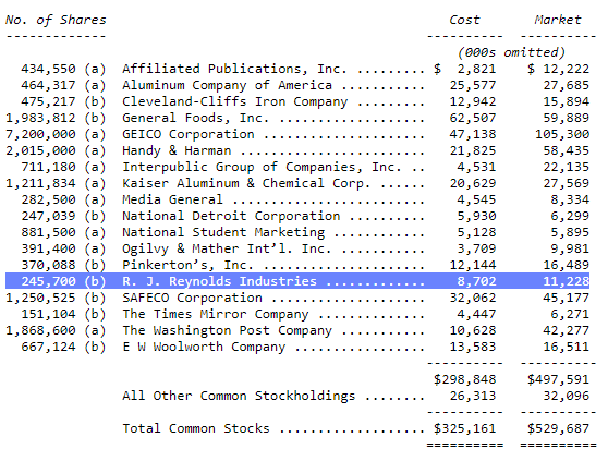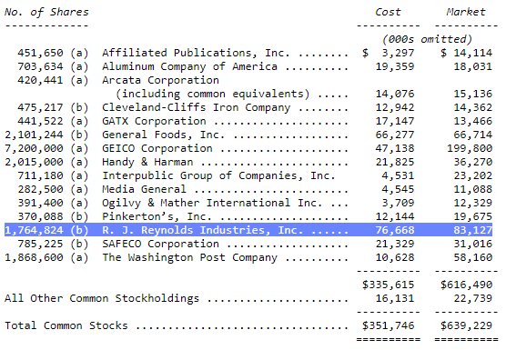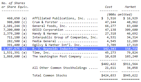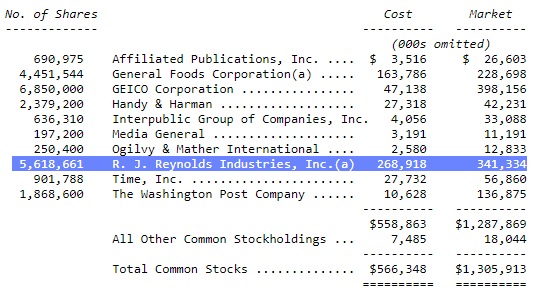 Buffett would go on to sell the RJR stake, recognizing a ~27% gain on the shares, excluding dividends received over the several years of ownership. Then, in 1985, Berkshire more than x3’d its investment in General Foods Corporation when it was purchased by tobacco giant Philip Morris.