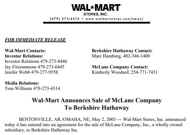 Wal-Mart Announces Sale of McLane Company To Berkshire Hathaway. Source