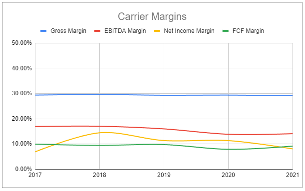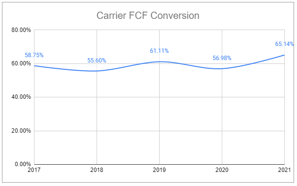 Over the last few years, along with the strategic acquisitions noted, Carrier’s R&D spending has been slowly growing, increasing from 2.2% of sales in 2019 to an expected 2.7% in 2022. The company’s sales force has also expanded from ~4,900 in 2019 to an expected ~5,800 in 2022. While other large competitors may apply pressure, I think it is most likely that Carrier grows faster than the markets it operates in by taking share from smaller participants, driven by differentiated technology, better service offerings, and geographic reach.