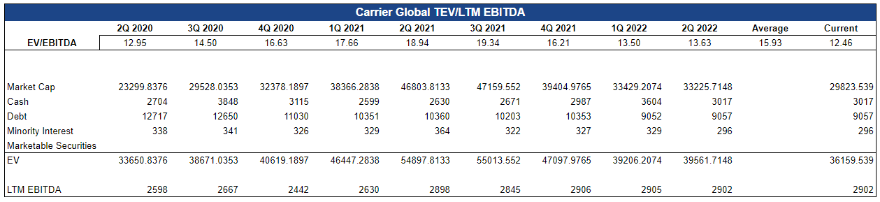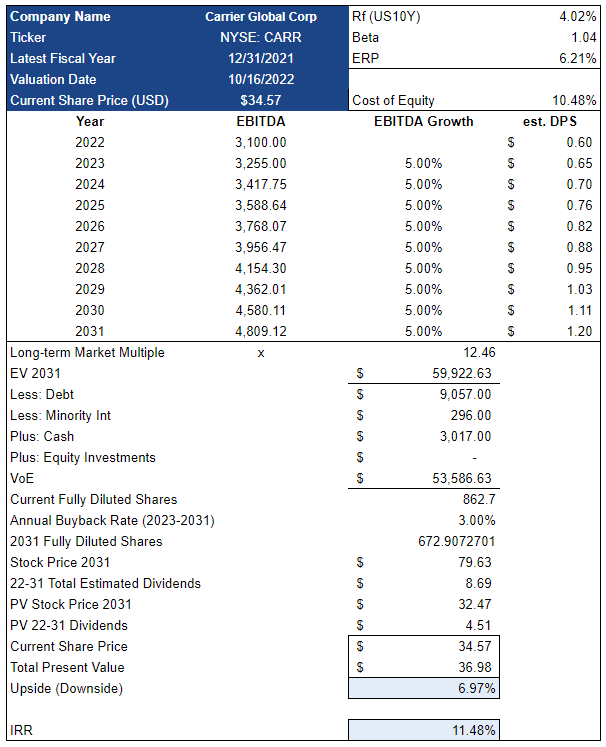 I valued Carrier using a 10-year exit based on backing out equity from an EV/EBITDA multiple and factoring in forecasted dividends and share repurchases.