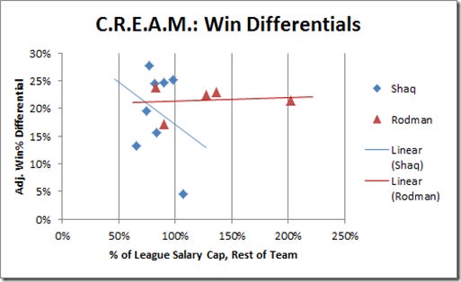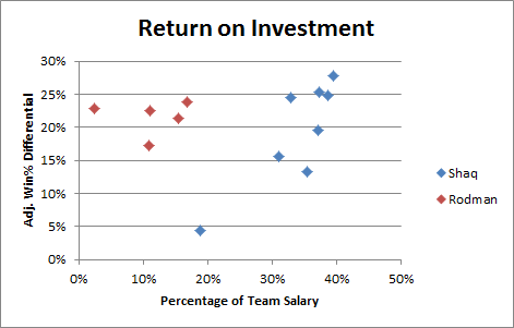 While Rodman’s career stats best illustrate his abilities to impact games, December 17, 1996, truly captures his freakish outlier status. That day, the Bulls played the Lakers. The Bulls were behind by 15 points, 72-57, 24 minutes into the game, struggling to contain Shaq, who was leading with 23 points. In the second half, the gargantuan 325-lb Shaq was guarded by Rodman, who was 100 lbs lighter and roughly half a foot shorter. On paper, the matchup appears hopelessly lopsided, yet Rodman’s unwavering endurance and sustained physicality led to Shaq only scoring 4 points in the second half, with only two shots in the fourth quarter and overtime. Despite having been desperately behind, the Bulls ultimately won the game 129-123. None of this is to detract from Shaq's unbelievable achievements—another one of the greats. But what should be highlighted is the return on investment each team generated from these two players. Not only did Rodman produce a staggeringly high adjusted win % differential despite being a relatively poor scorer, but he did so despite being a shockingly affordable asset to the teams he was on. As the adage goes: price is what you pay; value is what you get: