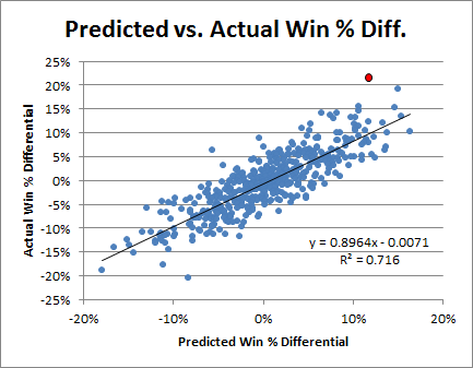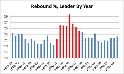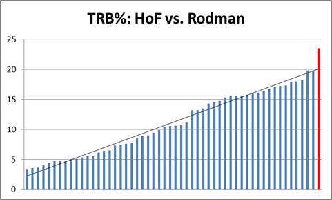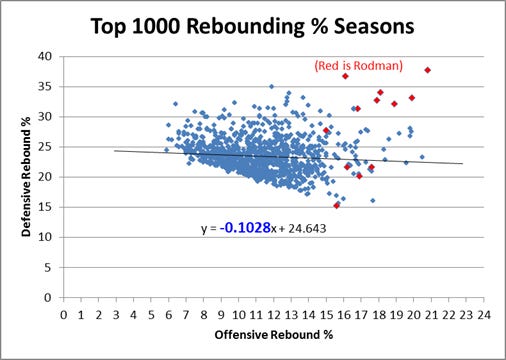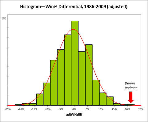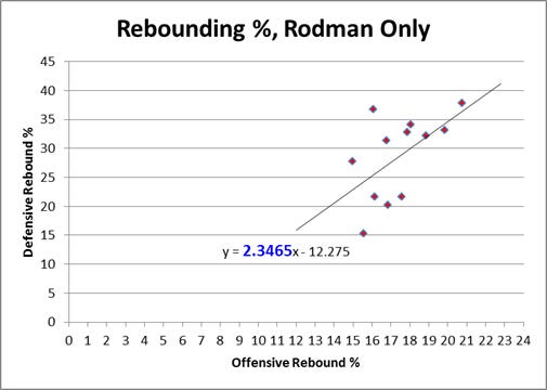 Numerous onlookers have performed significant statistical analyses to dissect the careers of professional athletes. Where Rodman is concerned, no documentation is as complete or more compelling than that of Ben Morris’s series, The Case for Dennis Rodman, on Skeptical Sports Analysis, which Cole cited in his paper. Along with several of the same figures cited, I believe additional charts best capture Rodman’s outlier status: