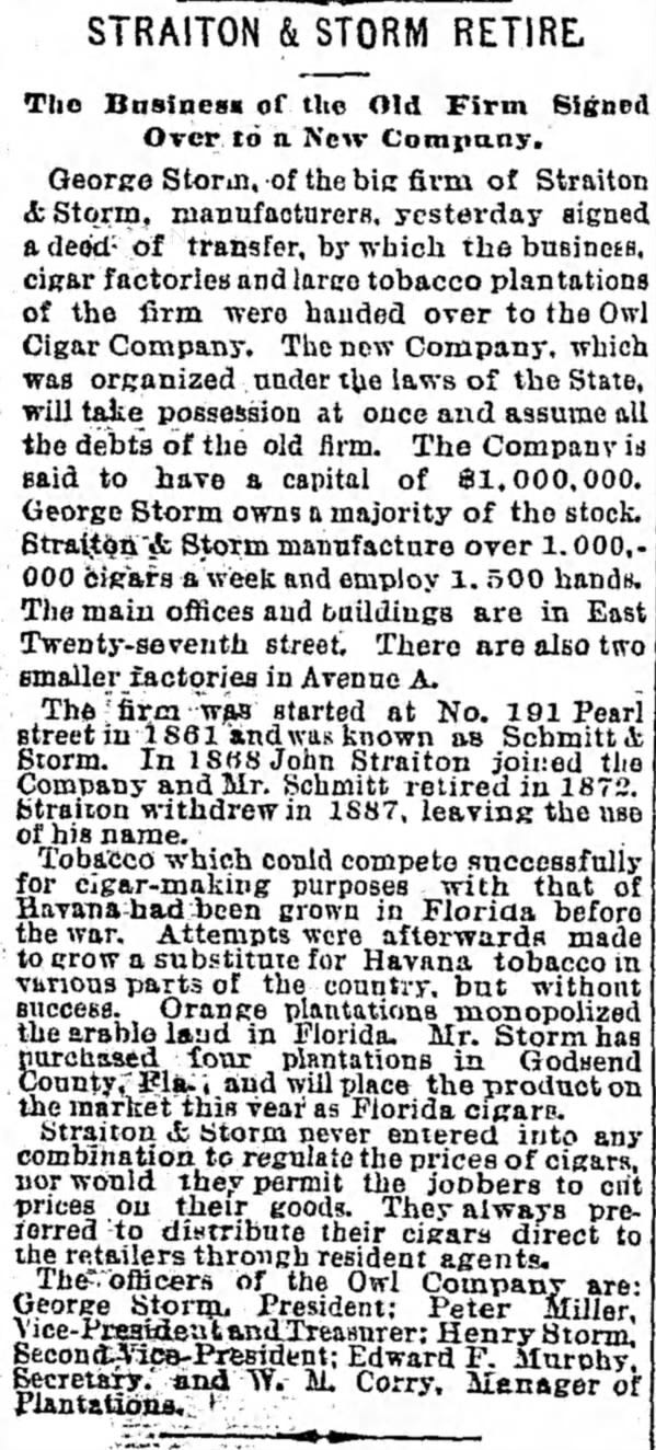 George Storm led the business for roughly seven years, until 1897, when Straiton & Storm was bought out by Kerbs, Wertheim & Schiffer, consolidating its operations to within its existing cigar manufacturing footprint. Then, in 1899, the American Tobacco Company acquired Kerbs, Wertheim & Schiffer’s cigar concerns (several years before ATC made more significant efforts to break into the US cigar market).