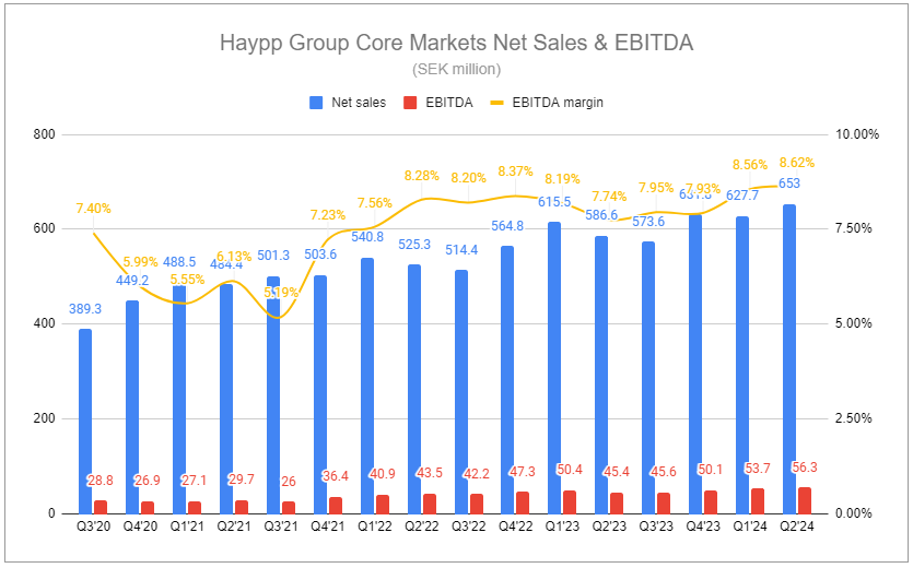 Several factors have masked Haypp Group’s long-term earnings potential. Continued reinvestment has suppressed margins, but even the topline's long-term growth trajectory remains partly disguised by multiple factors affecting sales mix across categories and geographies. Q2’24 net sales within the group’s Core Markets increased by 11% year over year. Nicotine pouch volumes within the segment increased by 33% in the period, while declines in snus continued to drag. Far higher than the 1.98% growth in topline for Q1’24, the longer-term trajectory is poised to be elevated, a function of NPs incrementally becoming a larger piece of segment volumes. Despite fervent competition in Core Markets, the group has retained share, and active consumer count has increased steadily. Margins also improved by a respectable 90bps, a function of mix shift and increased scale.