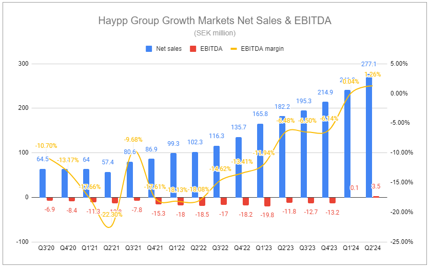 Improvement in profitability within Haypp Group’s Growth Markets is all the more impressive considering that many other online retailers have likely struggled amidst the ZYN shortage. Q1 marked a pivotal period, with the segment flipping to positive earnings contribution, and despite continued reinvestment, earnings have improved further. Alongside volumes leading to sales growth of 52% in Q2’24, scale benefits led to EBITDA margin expansion of 780bps year over year and 122bps sequentially.