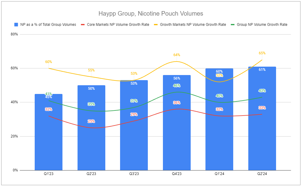 “Nicotine pouches now account for 61% of our total volume for the quarter, up 11 percentage points versus Q2 2023, and the robust trend continues. We’re particularly happy with the continued strong nicotine pouch performance in our Growth divisions, which grew 65% year-on-year after moving into profitability in Q1 and has continued expansion in margin in Q2.” – Gavin O’Dowd, Haypp Group CEO, Q2’24 Call