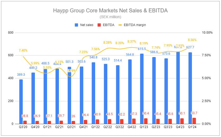 As guided previously by management, Haypp reported a new third segment in Q1’24: Emerging Markets, consisting of online vaping retail in existing European markets. This will be the reinvestment focus before the company transitions to branching out NP sales in new European markets, followed by expanding new RRP categories into new European markets. Q1’24 net sales for the segment reached 8.1 million SEK, with EBITDA firmly negative at -7.0 million, reflecting investments into commercial capabilities and product capacity. This segment undoubtedly presents a new tier of risk and reward, and reinvestment into it will weigh against the profitability of the core business, just as the Growth Markets had for years prior to inflecting. On one hand, there are looming threats of regulatory actions, such as disposable vaping bans, including within markets such as the UK. However, disposable vaping products within these markets carry substantially higher contribution margins, potentially allowing impressive operational leverage at scale, provided Haypp best utilizes its expertise of understanding the RRP scape and takes advantage of adult users’ propensity to be poly-users.