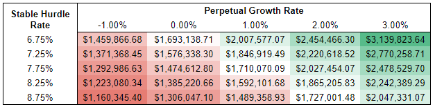 The “value of next year’s dividend” is pretty straightforward. The dividend, in this case, is simply the royalty payment. Take last year’s earnings of $114,253 and use our estimated perpetual growth rate of 1%, and it results in $115,395.53.