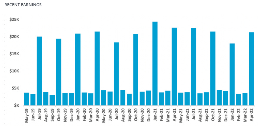 At the time of listing, this asset produced $114,253 in earnings over the last twelve-month period, .41% less than the 3-year average of $114,715. This indicates recent stability. When we break down paid earnings over the course of the years, things look slightly choppier, as domestic (U.S.) payments are paid monthly, and international earnings are paid quarterly.