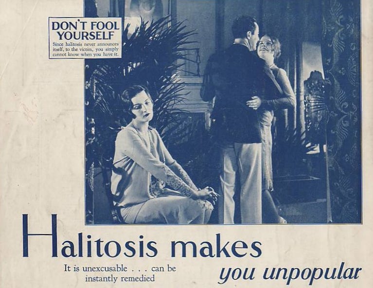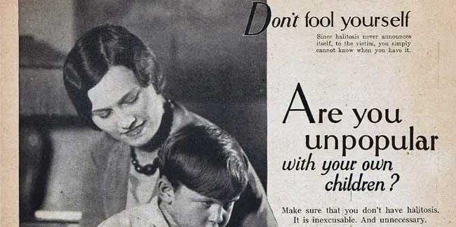 For starters, no one ever thinks they have bad breath. That makes it hard to convince people to buy a product that thwarts it. In 1920, Listerine began to leverage the term “halitosis” in its marketing. Halitosis, a Latin word derived from halitus (breathed air) and osis (pathologic alteration), simply means “bad breath.” It sounds scary, and the marketing worked.