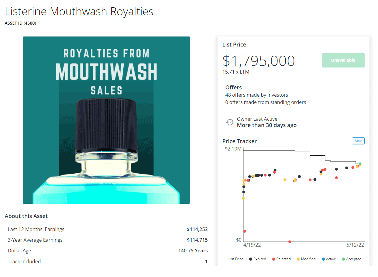 With an iron-clad court ruling, Listerine royalties represent a uniquely enduring cash-flowing asset. And every once in a while, one of the slices becomes available for purchase. In 2020, two separate listings were sold. Earlier this year, I discovered one on Royalty Exchange, a platform for buying and selling—yup, you guessed it—royalties.