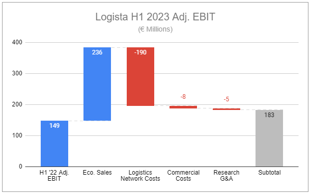 These three acquisitions bolster the group’s operations by offering express courier, parcel, and specialty long-distance haul services, expanding its footprint, and allowing for the recognition of synergies through cross-selling and further route optimization. These acquisitions, along with strong organic performance, led to adj. EBIT growing 23% y/y in H1 2023, with the reported figure up 14% for the period mostly due to charges related to closing a warehouse to further optimize its footprint. In addition: