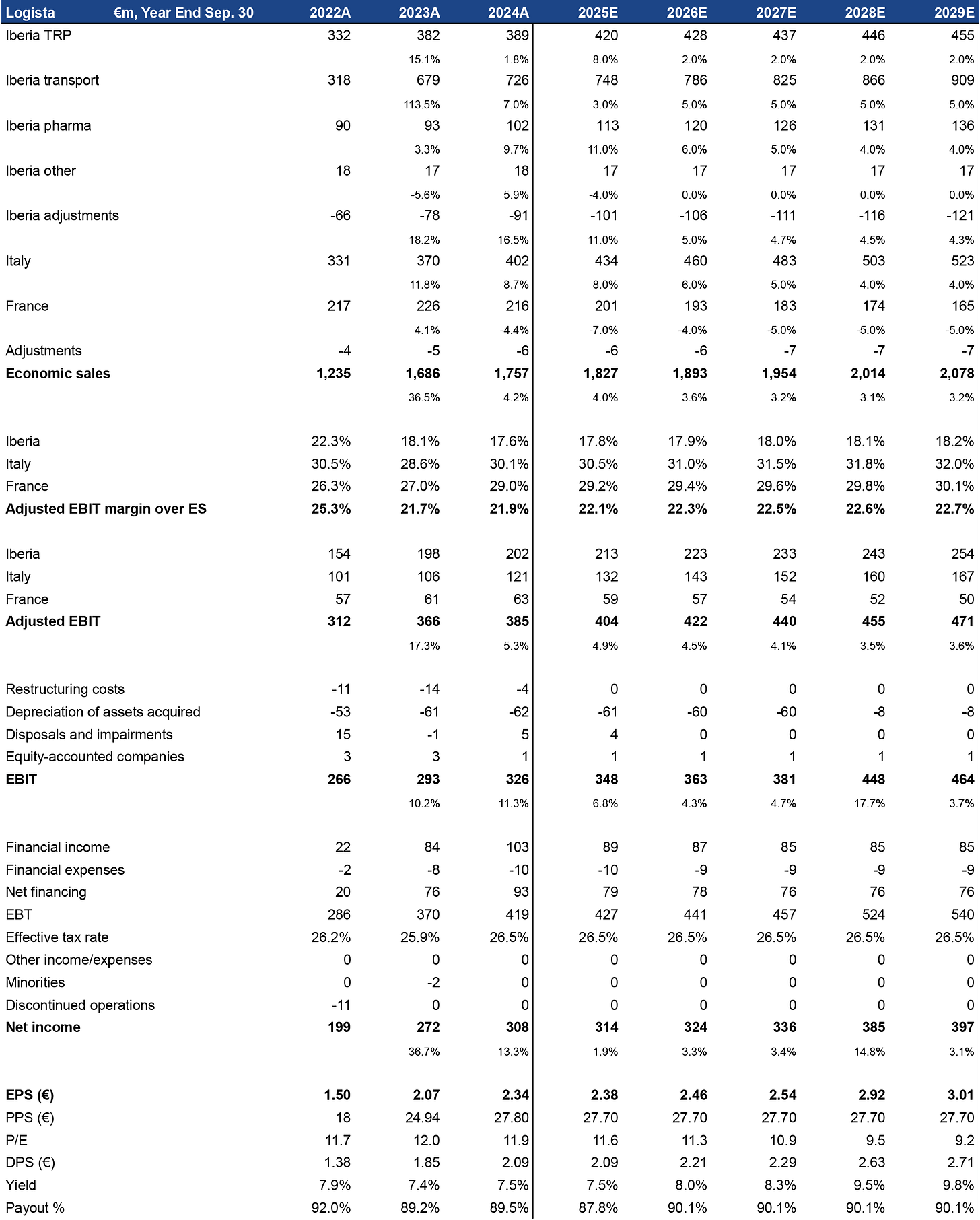 There is little to say that has not been repeated. Diversification has introduced bits of cyclicality while also pressing down on margins. Logista’s efforts to spread itself out have not been poor, but it would be easy to conclude such when comparing to the mighty profitability of the core tobacco business. Below, one of the infinite potential futures for 2025 has been illustrated. Minor adjustments have been made to segment economic sales and margins. The payout to shareholders in the coming year has been kept flat. The most prominent change is a notable decline in financial income from the group’s credit agreement with majority holder Imperial Brands. All together, estimates are roughly unchanged, with a share price providing a bar to be stepped over without much struggle.