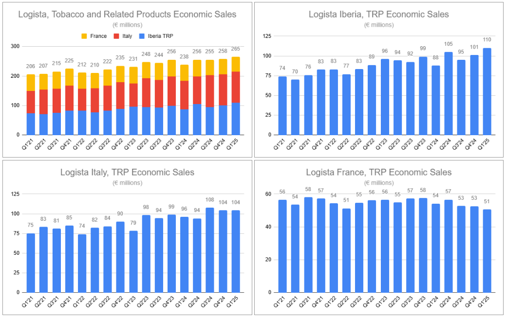 Logista’s tobacco distribution business in France continues to feel the crunch from substantially elevated decline rates in legacy products. At the same time, the country remains averse to embracing NGPs—now planning to ban nicotine pouches firmly. Q1’25 revenues were down by 1.8%, with economic sales down by 6.4%—a pronounced drop relative to Q1’24’s of -4%. Fortunately for the group, when looking at other parts of tobacco distribution, relief is provided in knowing France is, by a wide margin, the smallest of three.