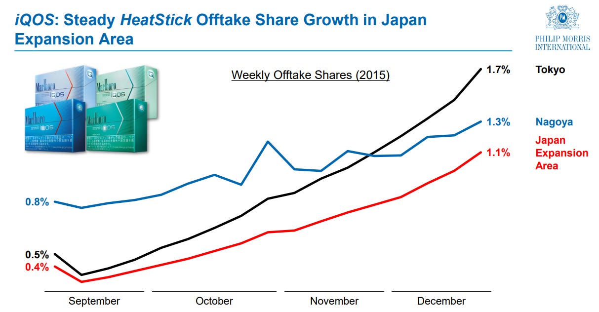 In November 2014, IQOS was first launched in Nagoya, Japan, followed by a similar launch in Milan, Italy. Most interestingly, heat-not-burn, as a category, could rightly be argued as a ridiculous technology. On paper, there are numerous reasons why the technology shouldn’t have succeeded. Developing and producing consistent devices is more challenging, and this process is expensive. Likewise, unless heavily subsidized, they are more expensive relative to other categories for the consumer. Ultimately, to best replicate the ritual of smoking within a reduced-risk system, disposable vapor, on paper, should be the de facto winner. Yet, heat-not-burn, led by IQOS, has been a radical success. Just over one year after launch, Philip Morris International highlighted the beginning of the ascent: