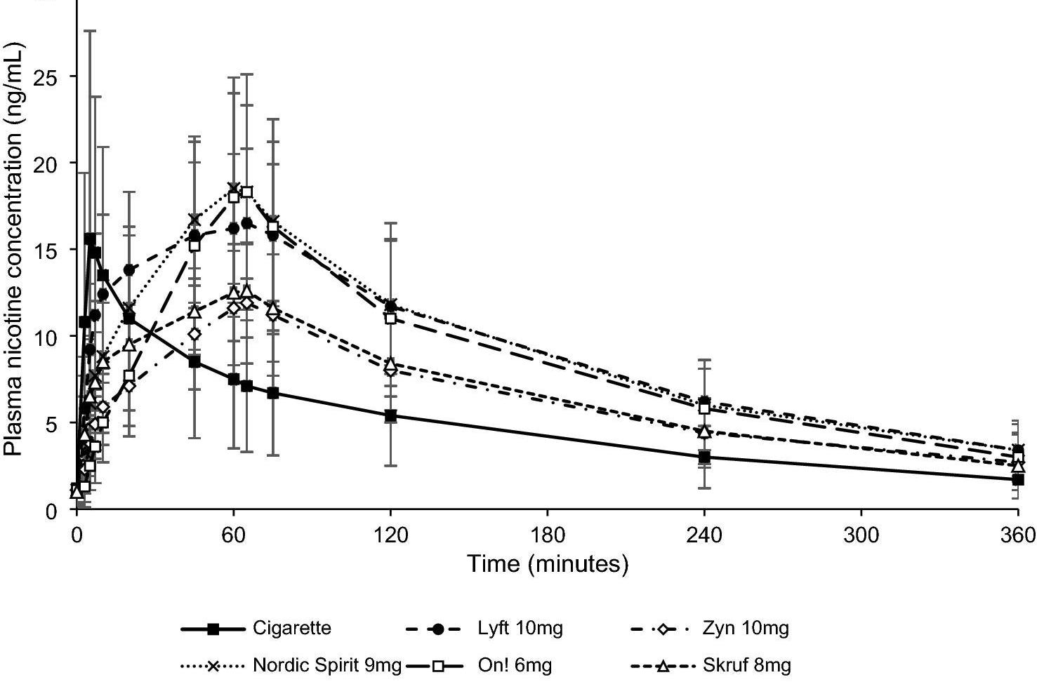 McEwan M, Azzopardi D, Gale N, et al. A Randomised Study to Investigate the Nicotine Pharmacokinetics of Oral Nicotine Pouches and a Combustible Cigarette. Eur J Drug Metab Pharmacokinet. 2022;47(2):211-221. doi:10.1007/s13318-021-00742-9