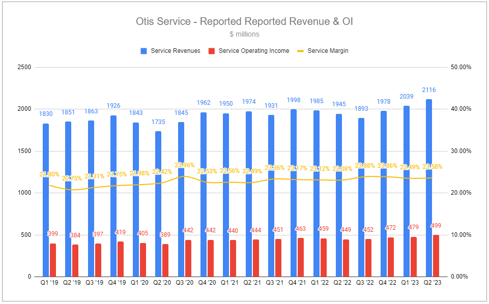 In Q2 2023, Service saw its installed base of maintenance units grow by 4.2% y/y, with growth in every region. This base is likely to grow ~5% for FY 2023 and at 4-5% per year going forward.