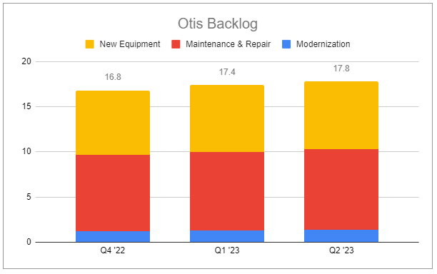 At this size, the company estimates that they’re looking out 18-24 months with the backlog. These numbers support continued operations, as decommits are at a low single-digit level due to the critical nature of work and the nonrefundable deposits the company takes. And even as they work through it—and even if there is weakness through H2 of this year—there is not an expectation that the backlog shrinks when entering 2024. During the Q2 call, Anurag Maheshwari, Otis CFO, offered excellent insight regarding how the backlog can actually continue to grow even without order growth (emphasis added):