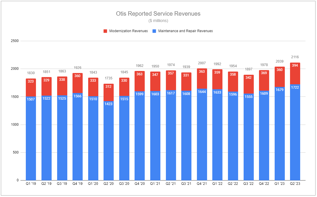 Modernization made up 18.62% of total Service revenues in Q2 2023, but it is going to be a major growth driver moving forward. In Q2, Mod orders were up 16% at constant currency, and the Mod backlog grew by 14%. Critically, this sub-segment also represents a massive opportunity for repurposed buildings as the shift to multi-use and WFH persists, as Judith Marks highlighted on the quarterly call (emphasis added):