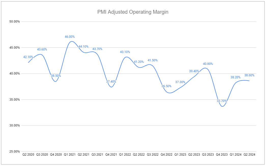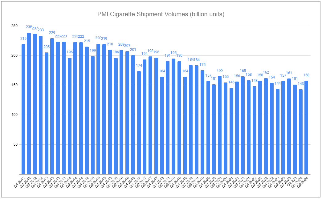 Perhaps it is not so surprising, as the company has stated its mission is to transition smokers to smoke-free products, but cigarettes continue to receive too little of the spotlight. It’s worth questioning the exact timeline management has in mind for disappearing the category, especially when the company’s combustible volumes are far from showing the precipitous decline that would be required for the supposedly desired outcome, in addition to the fact that pricing continues to drive tremendous profitability. FY’23 combustible pricing variance came in at +8.9%, far above prior years, and volumes were only down a small fraction. In my related note, I shared the expectation of combustible pricing variance likely falling toward a mid-single-digit level in coming periods. While directionally correct, the end result for the first half of 2024 highlights the power remaining within the legacy business. H1’24 pricing variance measured 8.3%. The elevated rate would leave one expecting volumes to have declined modestly. Yet, volumes were up 0.4% in Q2’24 and essentially flat in the first half.