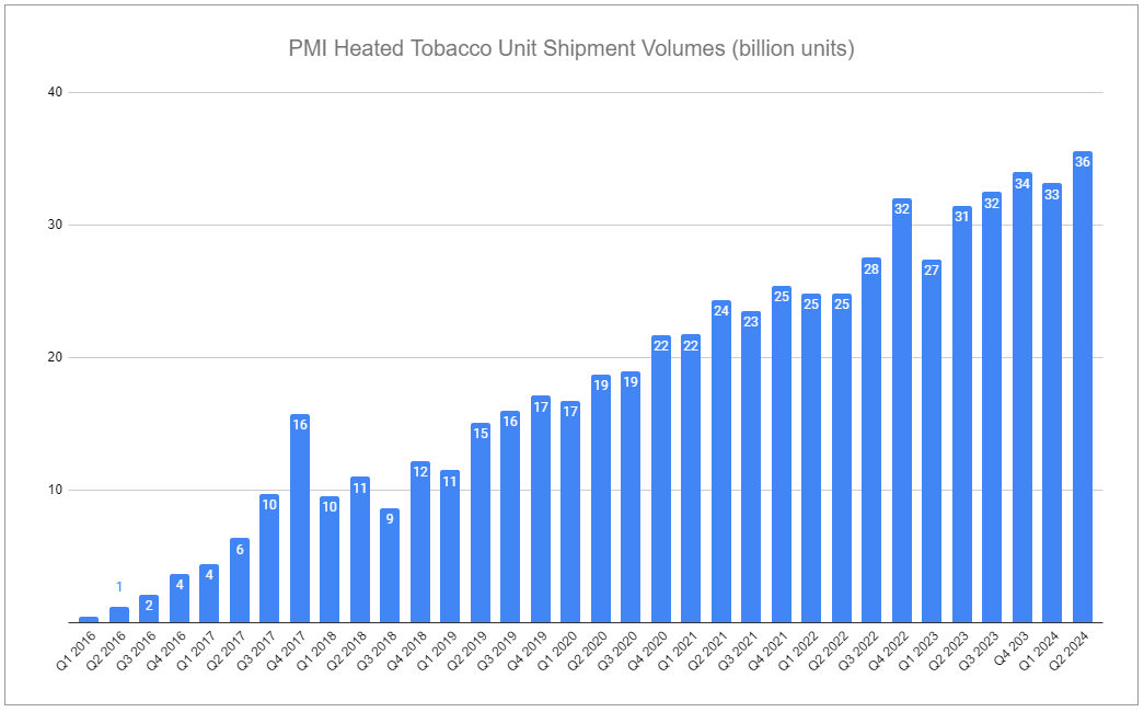 It could be argued that various inventory movements benefit or hinder the company, but on a quarter-by-quarter basis, those can be noisy. Truly, the strength of combustibles is all the more impressive considering the sustained growth of heated tobacco, with Q2’24 and H1’24 volumes up 13.1% and 16.8%, respectively. Granted, IMS—which better illustrates consumer offtake—measured considerably lower for the respective periods, at 10.2% and 11.4%, but we’re still talking about double-digit volume growth in a category that is partly cannibalizing legacy products. This performance is despite lapping the HTU flavor ban in Europe.