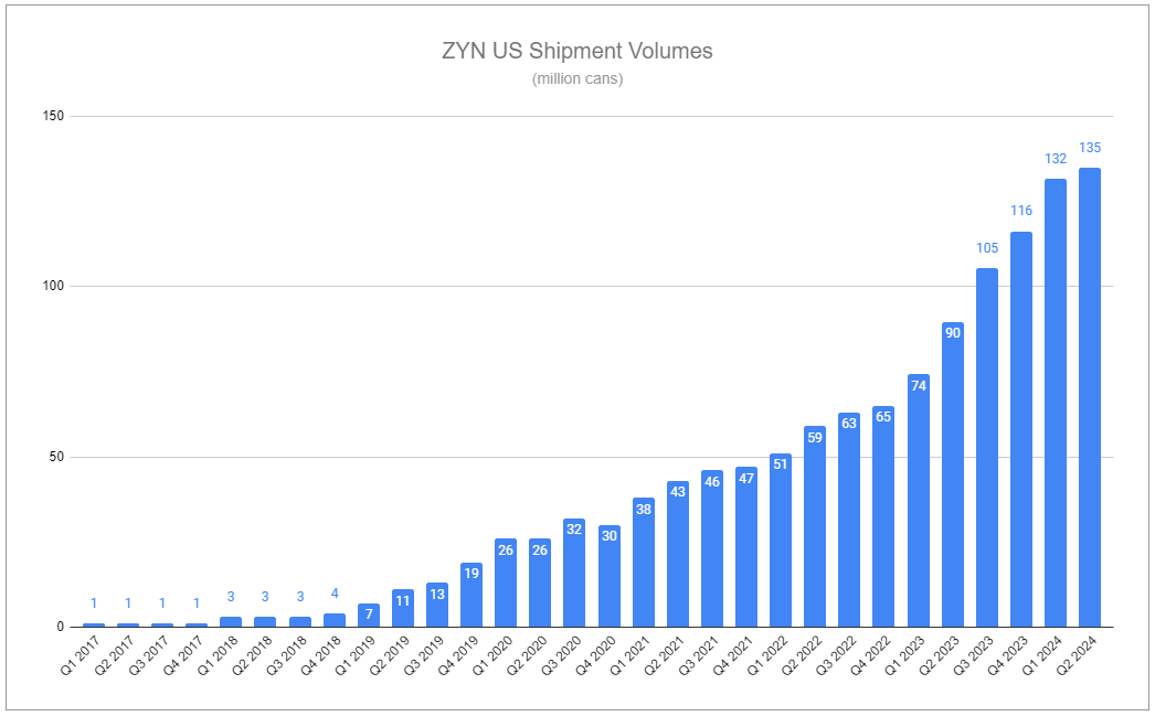 Let’s apply some numbers for context. At the end of 2023, guidance on full-year 2024 US pouch volumes was ~520m cans. Following Q1’24, the figure was modified upwards to ~560m cans. Guidance has now been further adjusted to a range of 560-580m cans in the US. PMI is taking two measures to increase ZYN manufacturing capacity, with a recent press release announcing a new production facility located in Colorado that is set to open at the end of next year and efforts to expand capacity at its Kentucky facility toward 900 million cans in 2025. If we were to simplify and assume that Q2’24 shipment volumes reflected maximum current capacity, the full-year potential would be 540m cans, implying incremental expansion in Kentucky that will materialize modest capacity improvements in Q4 to reach the new full-year range. If the company reaches the midpoint, it will represent a growth rate of 48% from last year and an increase of more than 139% compared to 2022 volumes.