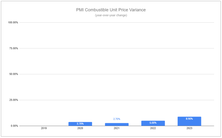 As remarkable as aggregate volume and share growth appear—undoubtedly receiving an inappropriate amount of focus by investors collectively—more impressive is that it was achieved despite aggressive pricing of legacy products. Organic combustible pricing variance measured 8.9% for the year, far above years prior. While this is set to revert toward mid-single digits in coming periods, it speaks to the dominance of the combustible portfolio, with consumers willing to pay a step up for PMI’s products. Conversely, not all combustible volumes should be thought of as equal. PMI’s geographic mix evolves toward volume growth markets sporting lower margin profiles, costs have continued to rise, and FX impacts persist, leading to financial results notably weaker than price take would suggest on a surface level. For 2023, combustible net revenues were up 3.5% and up 5.5% organically for the year, and gross profit was up a mere 0.3%.