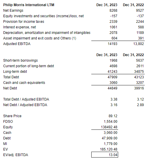 While management appears a bit more upbeat on FX impacts in 2024, such headwinds will likely remain non-trivial. However, as stated before, the growth of USD-derived revenues courtesy of Swedish Match, further aided by a potential moderate success of IQOS in the US in coming years, will undoubtedly help balance the swings. I remain steadfastly focused on the notions that nicotine is a global growth industry, PMI has a unique position, and that position will provide ability to grow at a high-single-digit clip while actively deleveraging and returning capital to shareholders. As the company moves closer to its target leverage of x2, share repurchases are to resume, likely in 2025, further supporting growth on a per-share basis.