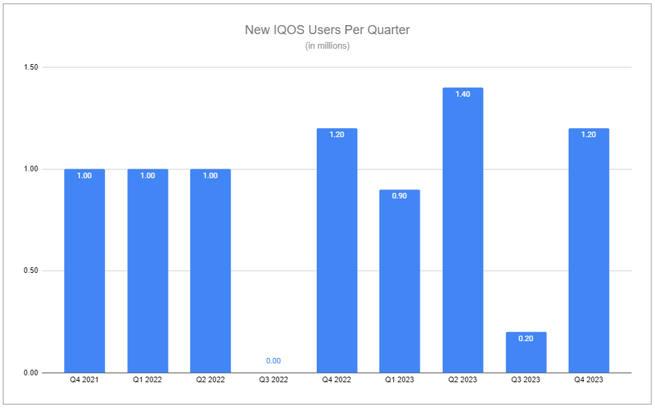 Unquestionably, added incremental value, as reflected in free cash and EPS, remains elusive, but that does not mean that it will remain so. PMI continues to play for the long term. Throughout 2023, IQOS ILUMA was rolled out to the majority of markets in which PMI operates. The product is a significant step up in quality, reliability, and user experience by all measures, which continues to be reflected in the evolution of HTU units, IQOS users, and share. IQOS HTU shipment volumes increased by 6.09% in Q4 2023 and by 14.74% for the full year. The number of IQOS users continues to climb, adding 1.2 million in Q4 2023 and a robust 3.7 million since Q4 2022.